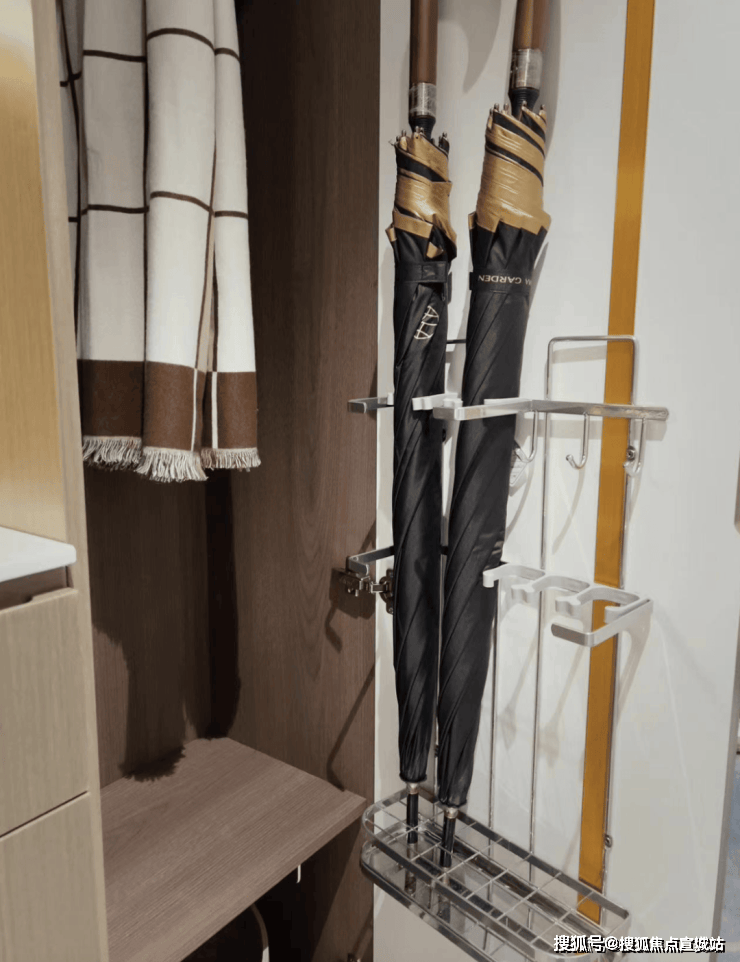 细节方面,进门的玄关柜,设计了伞架和置物架,下雨天也不会把室内弄的潮湿。