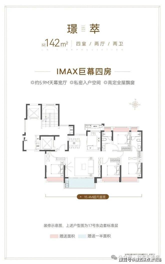 具体户型:建面约 101㎡的三室两厅两卫,三开间朝南,整体面宽约 11.5 米,约 5.3 米阔尺横厅;建面约 124㎡的四房两厅两卫,四开间朝南,南向面宽约 12.8 米;建面约 142㎡的四房两厅两卫,约 5.9 米阔尺宽厅,约 15.4 米南向面宽,采用类一梯一户设计。