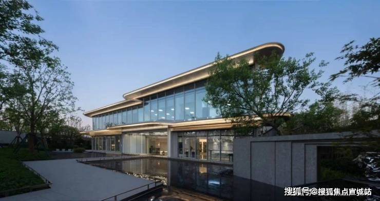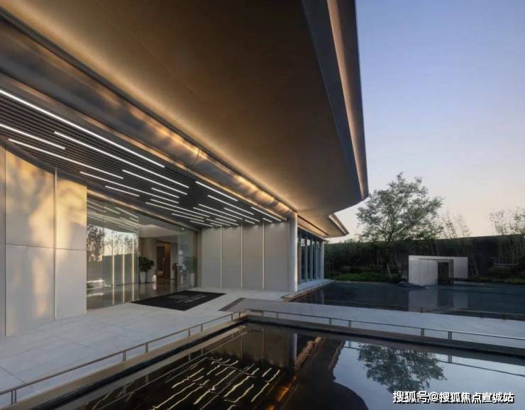 屋顶错落有致,悬挑而出,屋盖宽广,宛若空中流云,又似续写环秀湖畔岸线绵绵流长。社区大堂吊顶采用模拟湖水波纹的泛光效果,灯影交错,波光闪烁,映于池水,光影绮丽。