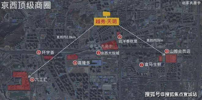 刨去大悦城,在阜石路两侧密集分布着远洋春秋里、喜隆多、山姆、环宇荟等商业。哪怕是最远的六工汇,直线距离也不过2.7千米,基本就是一脚油的事儿。