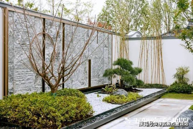 入口右侧是迎宾的组合造景,选用泰山石组景以及黑松、砾石等中式元素,和小区整体江南水乡风格相得益彰。