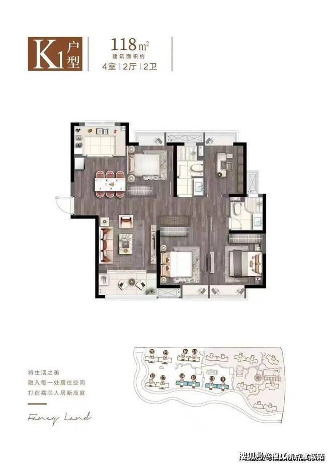 9-10-13-14号楼边套,118㎡4房2厅2卫,总高18层(两梯三户),共144套.