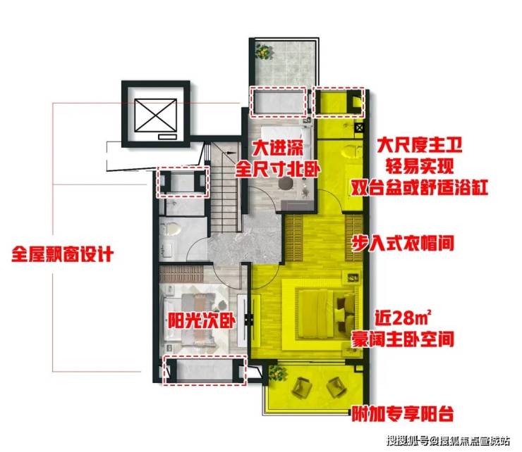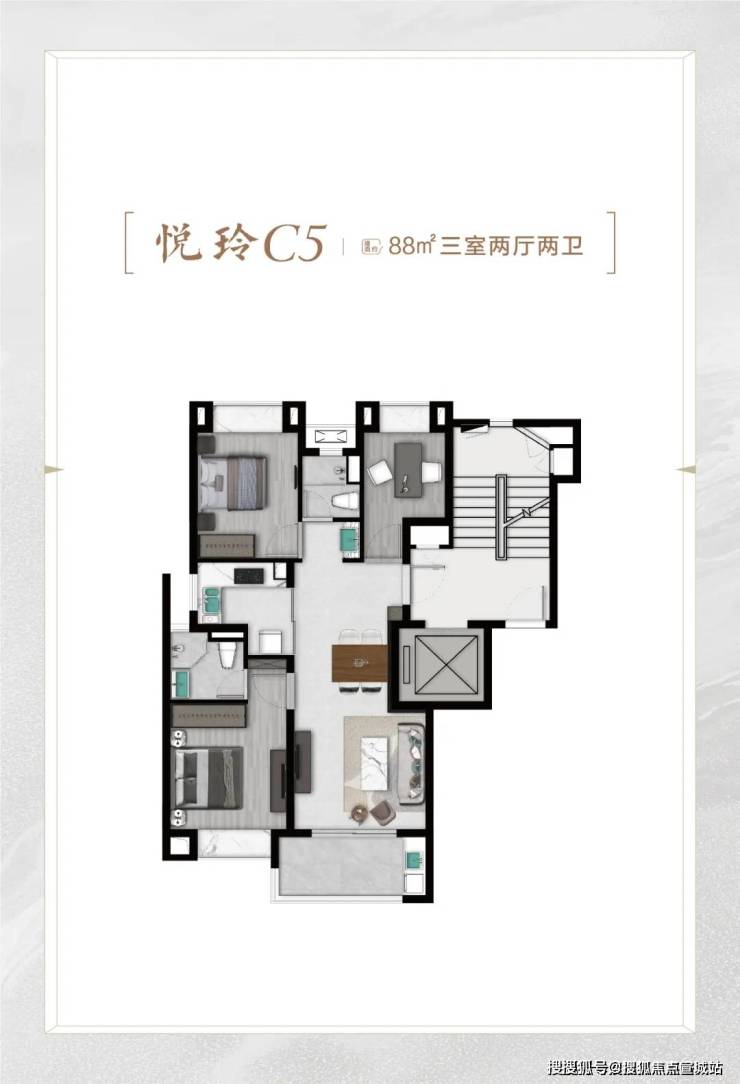 再比如C6悦尊户型,建面约96㎡3房2厅2卫,比C4悦奢户型少3㎡,总价也适当降低。C4户型该有的优点,也全都有,比如: