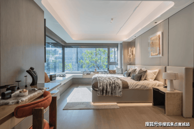 主卧套房设计,预留衣帽间空间,带独立卫生间;主卧的飘窗,是一大亮点所在,270°转角飘窗,带来环幕级景观视野。