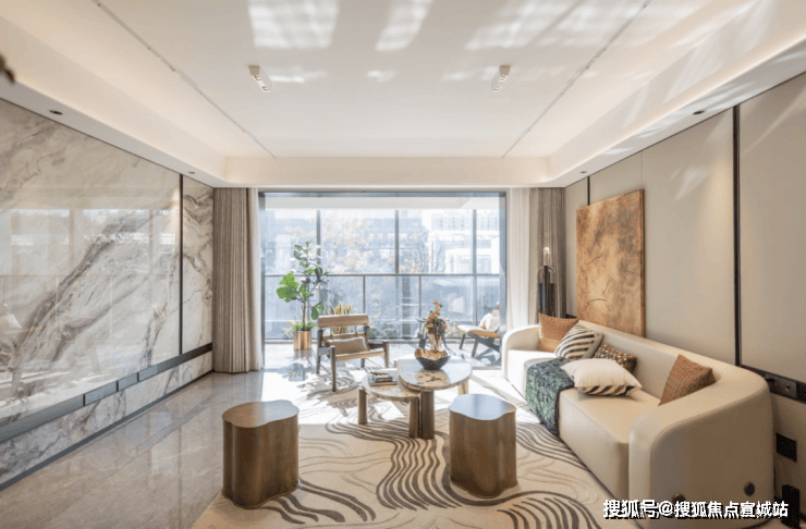 整体大面宽客厅,以岩板背景墙作为点缀装饰,弧形吊顶,造型别致,空间品质大幅提升: