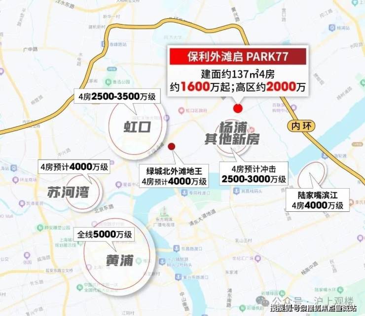 北外滩地王4房预计售价 4000万级;虹口其他新房4房价格普遍在 2500-3500万;静安苏河湾4房预计 4000万级;陆家嘴滨江4房同样 4000万级。如此对比之下, 保利外滩启PARK77高区2000万级4房的价值,可谓市中心“独一份”