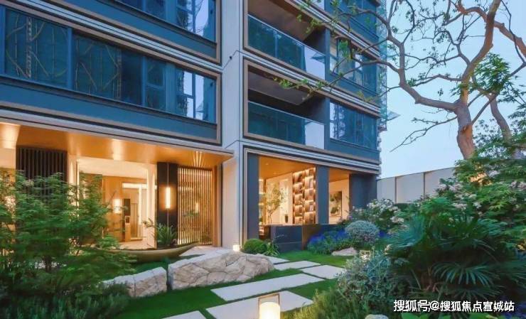 第一进:星级酒店的入户门头搭配入户水景,让入户更具仪式感、同时通过院内布景的遮挡,让小区内部景观增添一抹神秘感;