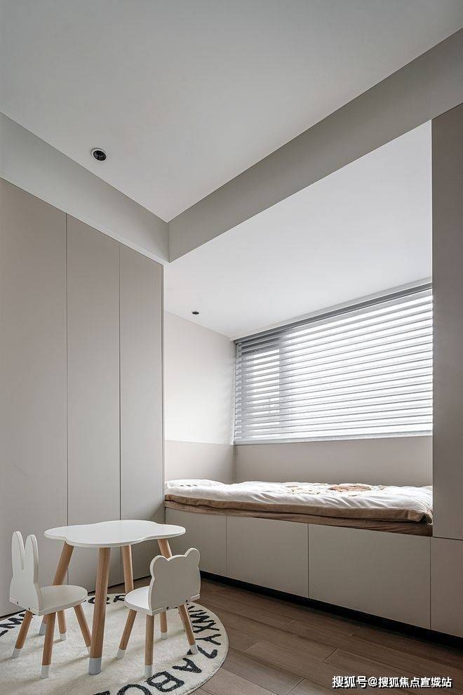 Althoughthespaceofthesecondbedroomisnotlarge,thebuilt-inoverallwardrobedesignhighlightsanobleandeleganttemperament,delicateandpractical,whilethecartoontableandchairbringendlessfunandsurprisetothechildren,sothattheirchildhoodisfullofwarmthandhappiness.