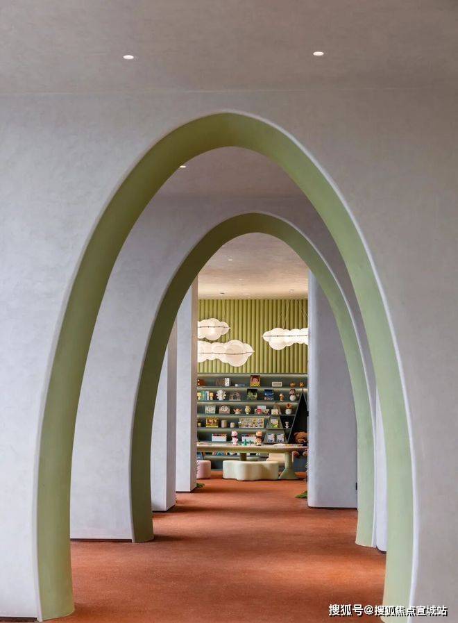 第二个,“向阳而生”。运用大面积的落地玻璃窗,让这个区域变的更加透亮。让绿意充分渗入,实现近距离、无遮挡观景视野。试想一下那个画面,当家长在外奔波一天,回家的路上,看到暖暖的光从玻璃盒子中映射,孩子笑的天真烂漫,回家的脚步也会不自觉的变得轻快了。
