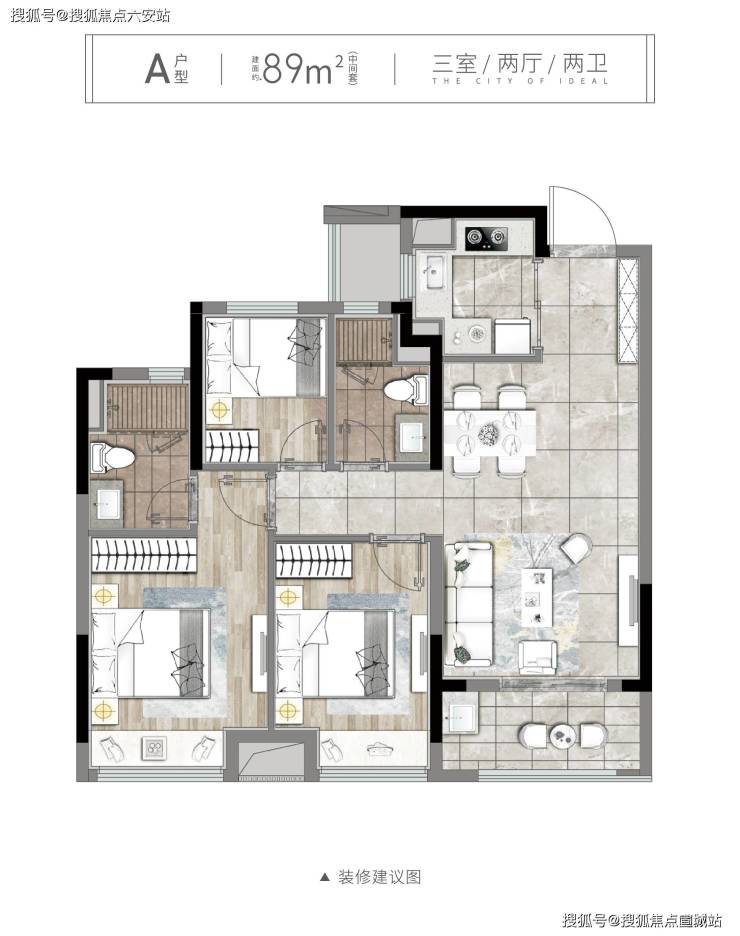 -**建面89㎡**:三房两卫,南向6米双联阳台,LDK一体化餐客厅,得房率超80%.