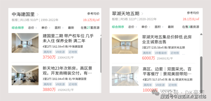 可几年之后,当它们双双站上二手房市场,价差却被一步步拉大,一个最高挂牌23万+,另一个已经远超31万+: