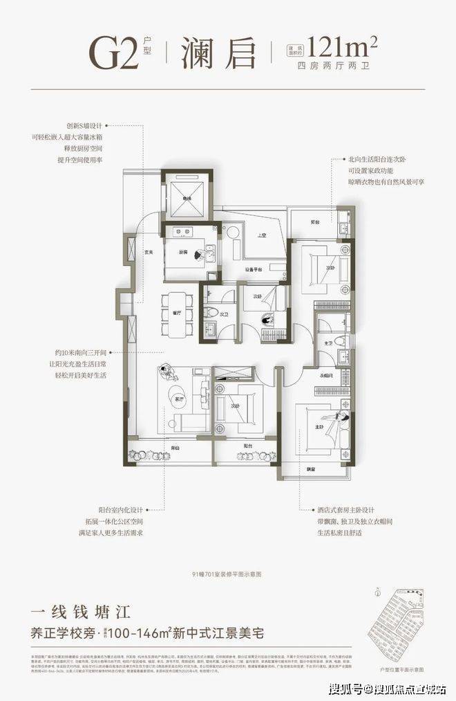 云启钱湾高层分为4种类型,建面约100㎡和建面约121㎡户型,做了创新S墙设计,提高了空间利用率,对年轻家庭来说,也是非常友好的.建面约146㎡四房户型,全部南向面江,大部分楼层还可看到一线江景.