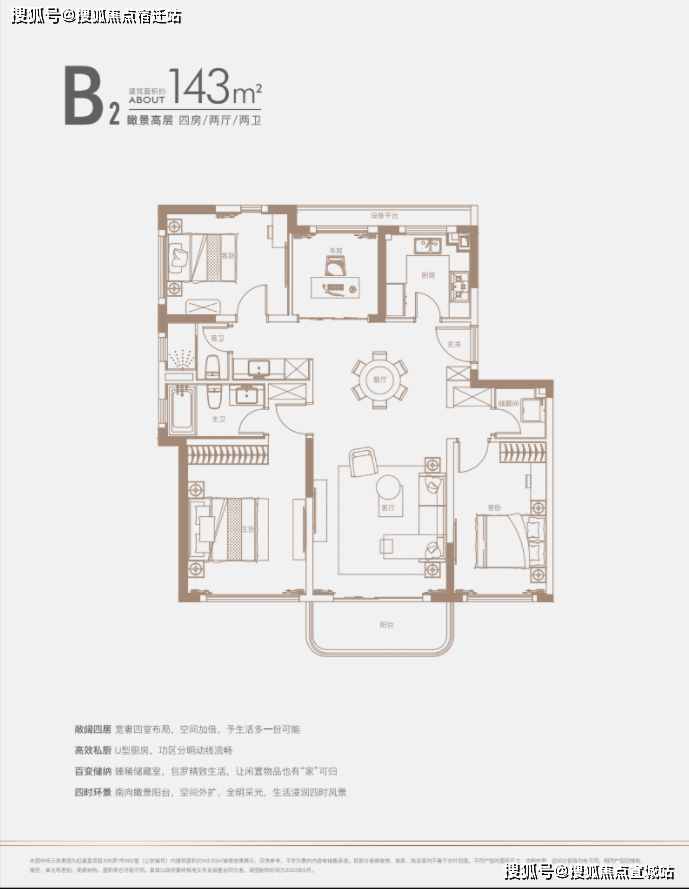 建面约140㎡四房:三开间朝南户型,南北通透,采光条件优质,客厅明亮宽敞,彰显大气布局。