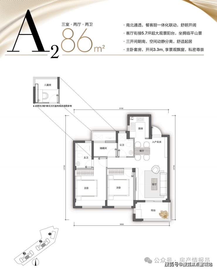该户型定位 90 后三口之家,整个空间以简洁静谧作为主基调。