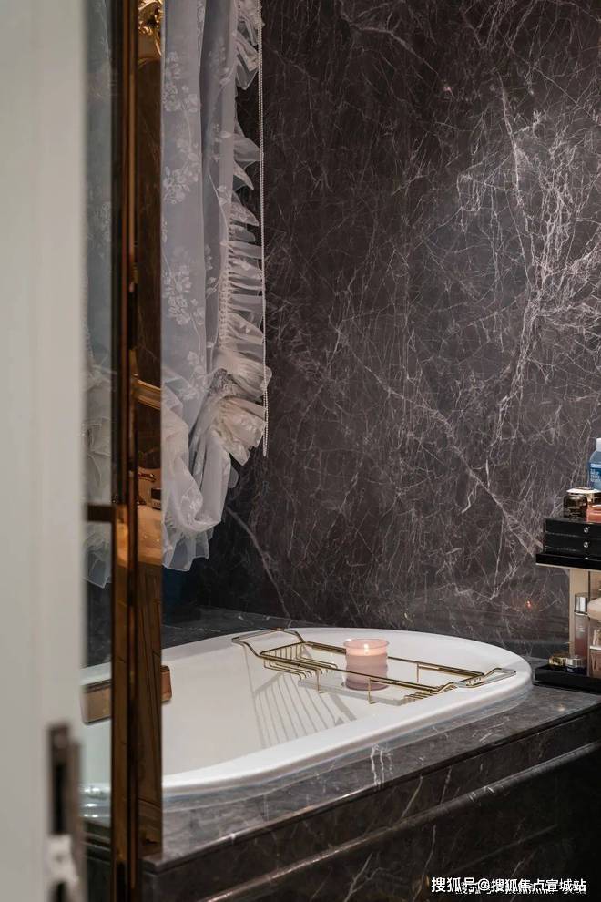 即便是私密的卫浴间,挚友也未曾忽略对美的追求。简一阿波罗灰墙地通铺,与质感水晶灯、法式风洗漱台相得益彰,展现出低调而高级的自然美感。