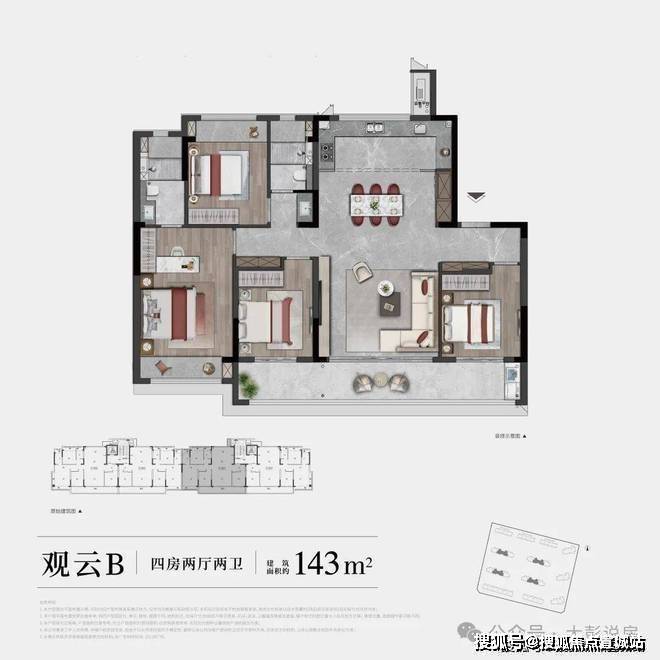 四房三套房设计,四开间朝南,约16.3米面宽,采光、视野极佳;