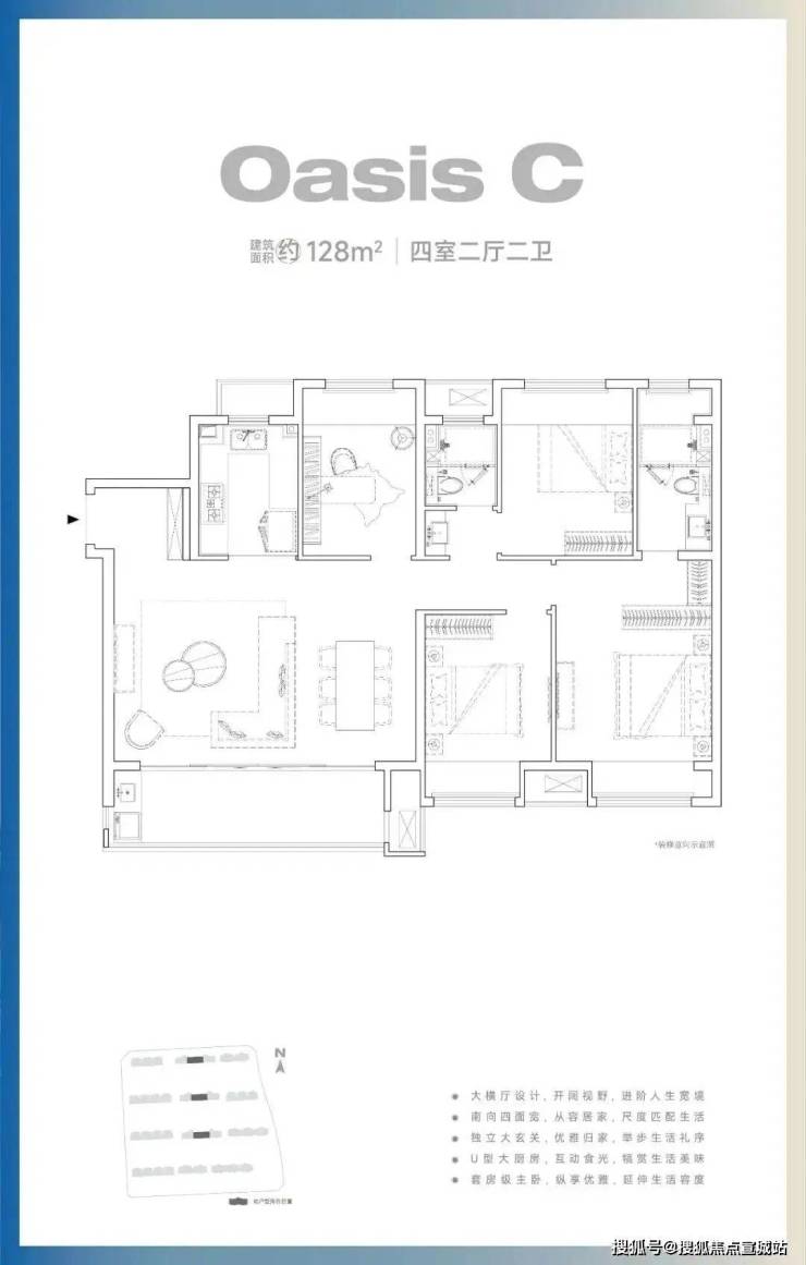 建面约128㎡四室两厅两卫设计,经典大面宽设计,开放式的餐厅、客厅、厨房,实现不受限制的多样生活.主卧套房,设有L型衣帽间、独立卫生间,生活品质提升了一个档次~