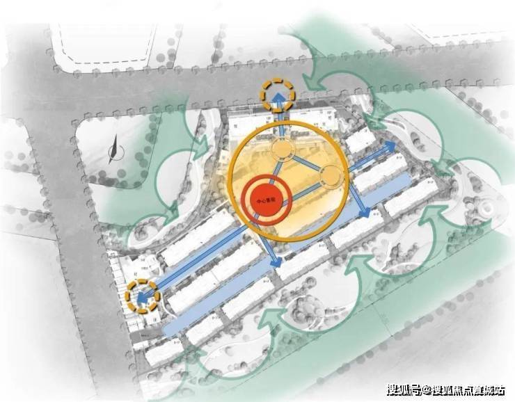 项目总体布局体现为“一环、两轴、三围合”的设计构思。一环”是指连接小区主次入口的主环道以及形成小区中央的大花园,“两轴”是指贯穿小区东西和南北两条相交的主要景观轴线,“三围合”是指小区南侧有50米城市绿化带,东侧和北侧均有20米城市绿化带,三面均被景观绿化带和东侧的长山直河、南侧的官河,北侧的郎家浜河所环绕,自然景观俱佳。