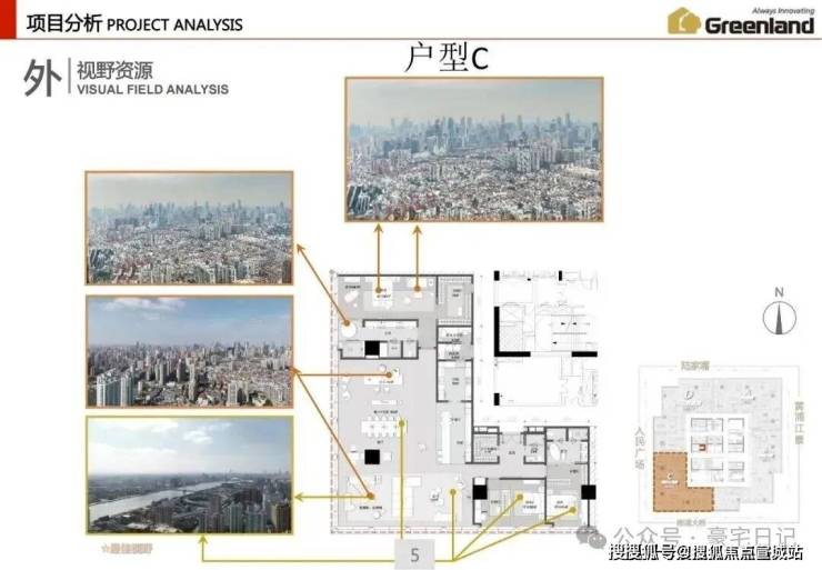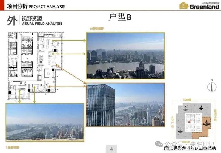 本案北视角:陆家嘴、北外滩;西视角:人民广场、新天地;东视角:浦东、黄浦江;南视角:南浦大桥、世博园。