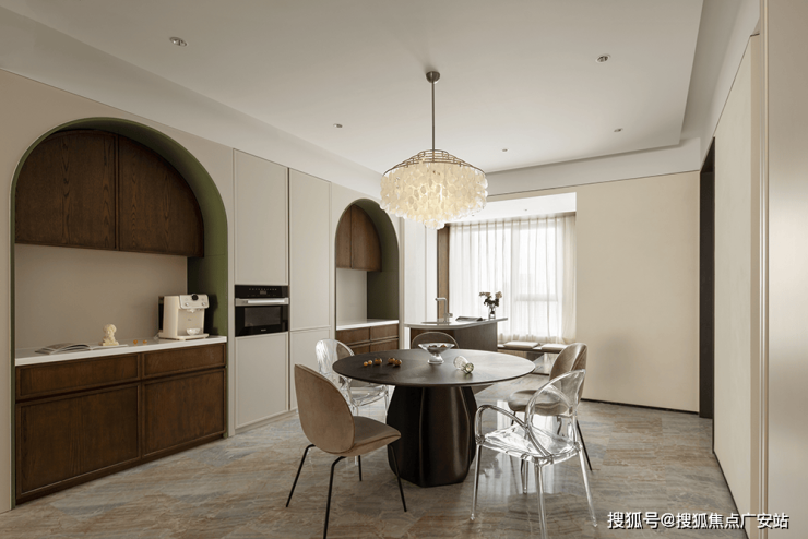 内置双拱门造型,利用空间穿插、错景,划分餐厅与西厨区,开放互动气质与当代审美相结合,隔而不断,界而未界,留给空间更多的想象和延伸.