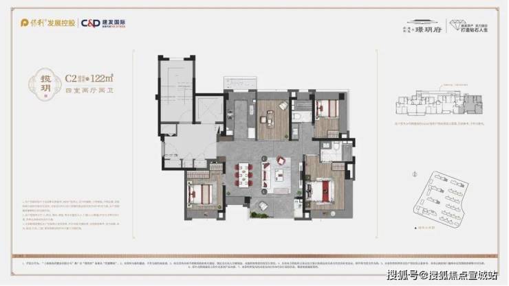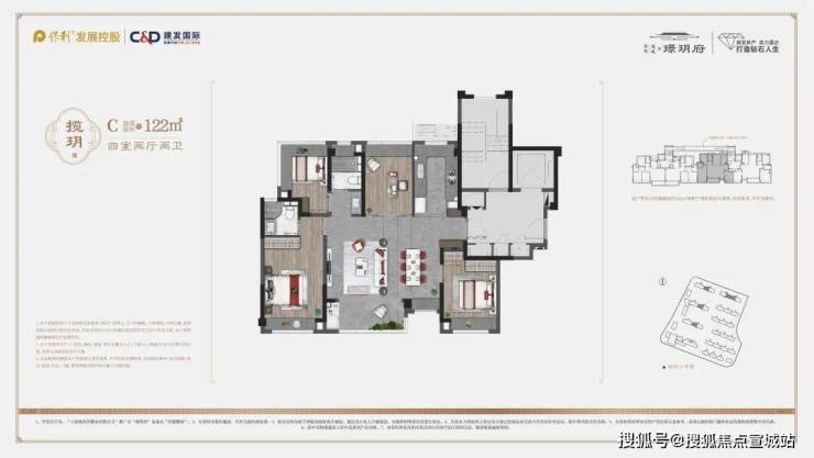 高层户型建面约 91㎡3 房 2 厅 1 卫、约 103㎡3 房 2 厅 2 卫、约 122㎡4 房 2 厅 2 卫;