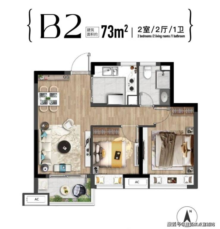 建面约73㎡的2房户型,以其优越的空间布局生动诠释了“小户型也有大面宽”。