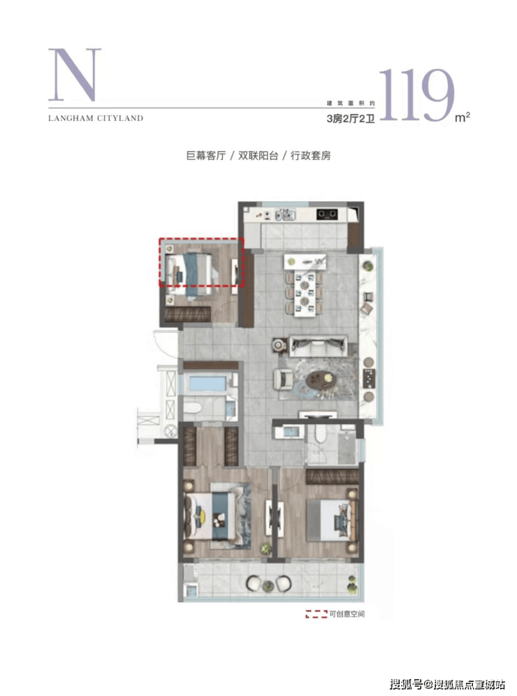 尤其北卧室270度的大落地窗设计,空间通透又大气。此外,项目建面约138㎡的四房两厅两卫,竟然做到了四开间朝南,约14米的超大面宽简直不可思议。要知道,奥体建面约233㎡的户型,朝南面宽也不过约16米。