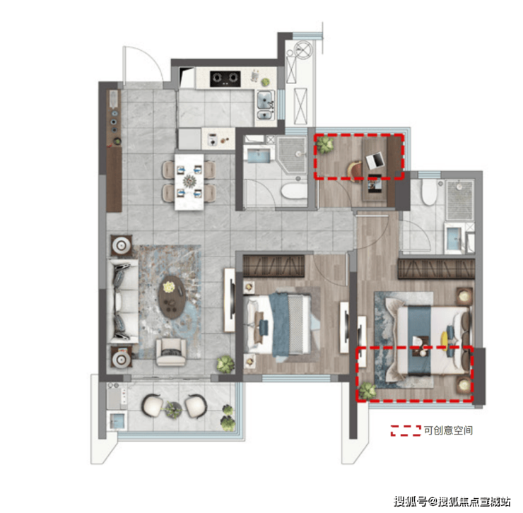 北面的两个房间各有一小半的拓展面积,因此相对于市面上的其他楼盘,得房率是比较高的。北面卧室有一个L型的窗,采光、视野、通透性都大为提升。