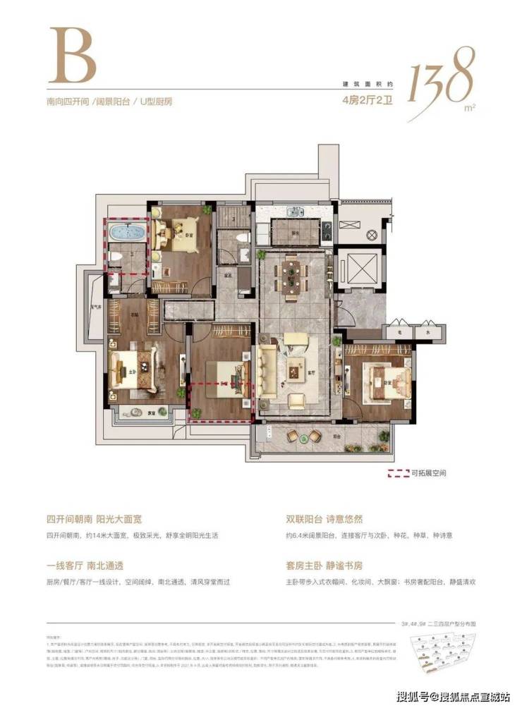 建面约138㎡四室二厅二卫:客厅与次卧共享约6.4米的跑道式双阳台,空间非常大气。主卧走入式衣帽间以及预留浴缸位,精致改善生活可以想见,整个洋房户型的得房率约90%,空间利用率非常高。约14.2米的超大南向面宽,让整个室内通透明亮。串联起客厅和次卧的阳台,长约6.4米,摆上一排绿植,莳花弄草的诗意日常在家就能实现。