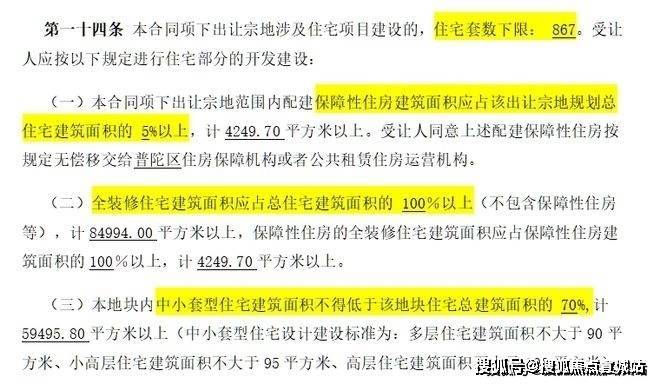 该地块用途为普通住宅,其建筑密度大约为2.5,高度限制为80米.住宅单元数量不得少于867套,必须建设至少5%的保障性住房.中小户型的比例应不少于70%,并且所有住宅都实现全装修.