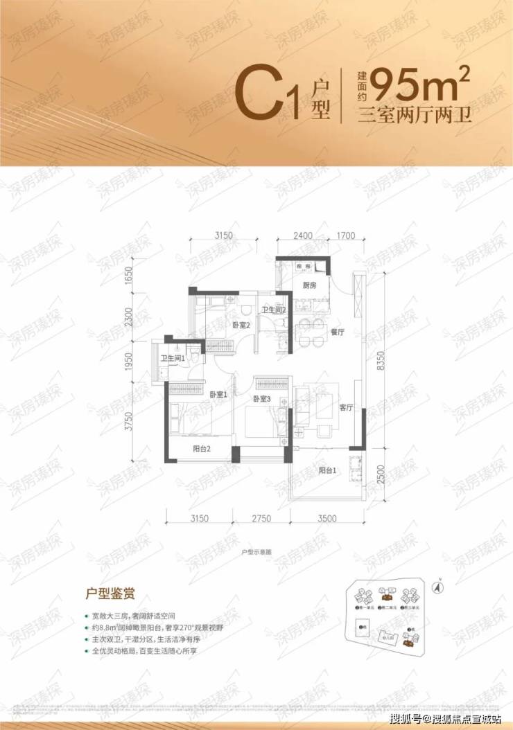 95㎡的3房2厅2卫,设计的是经典竖厅格局,客厅3.5米开间,进深8.35米,LDKB一体化设计,三开间朝南,3个卧室分别做到了主卧13.8㎡/次卧10.31㎡/次卧9.13㎡(包含墙体飘窗),U型厨房,公卫三段式分离,得房率约90%(包含赠送),西南或正南朝向。