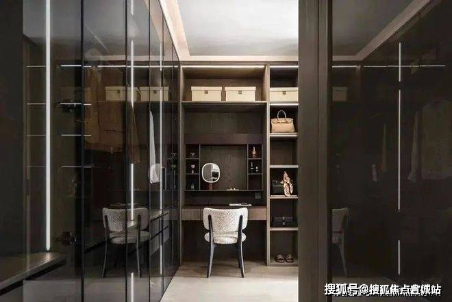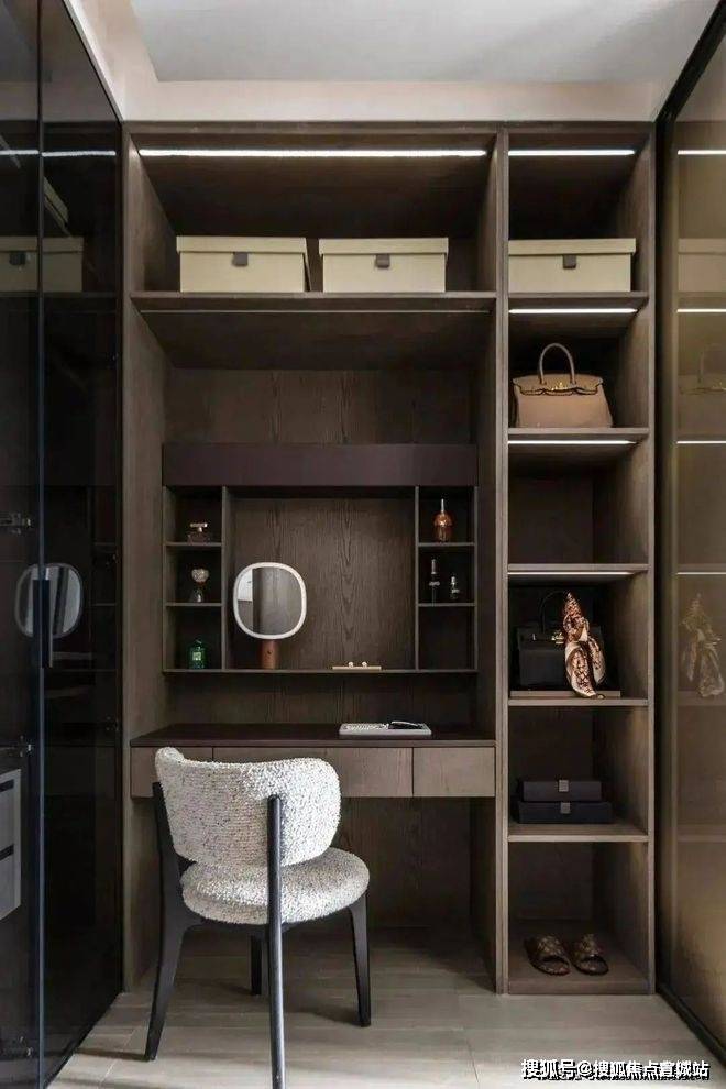 衣帽间内深胡桃木色所散发出的温暖光泽,与柔和的灯光相互映衬,更添几分温馨与雅致.无论是晨光初照还是夜幕降临.