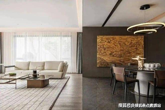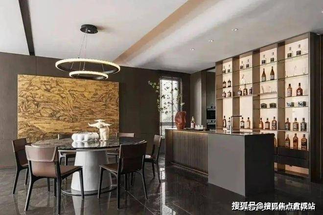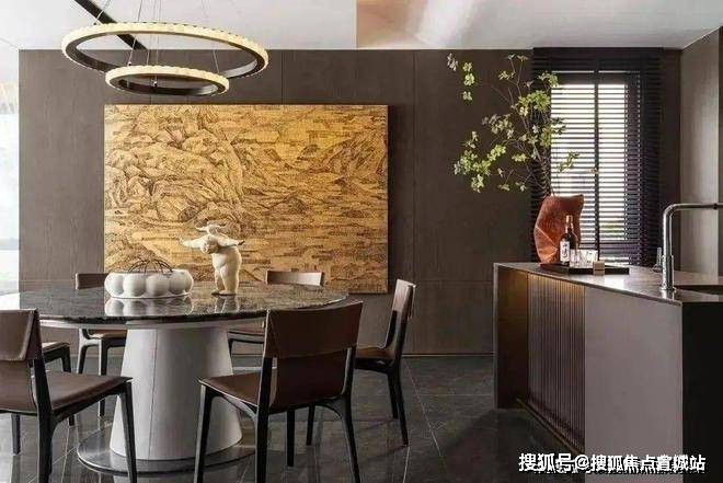 客厅与餐厅的交汇地带通过精心挑选的差异化地板材质,设计师巧妙地构筑起一道无形的软性分隔屏障,餐厅中央设置的开放式岛台,不仅作为烹饪与聚餐的灵活中心,还巧妙地将空间功能进行了转换与融合,同样的作用也在吊灯的设计上显现.墙面上悬挂的巨型壁画,导着居住者的审美情感,让生活空间充满了故事感与个性色彩.