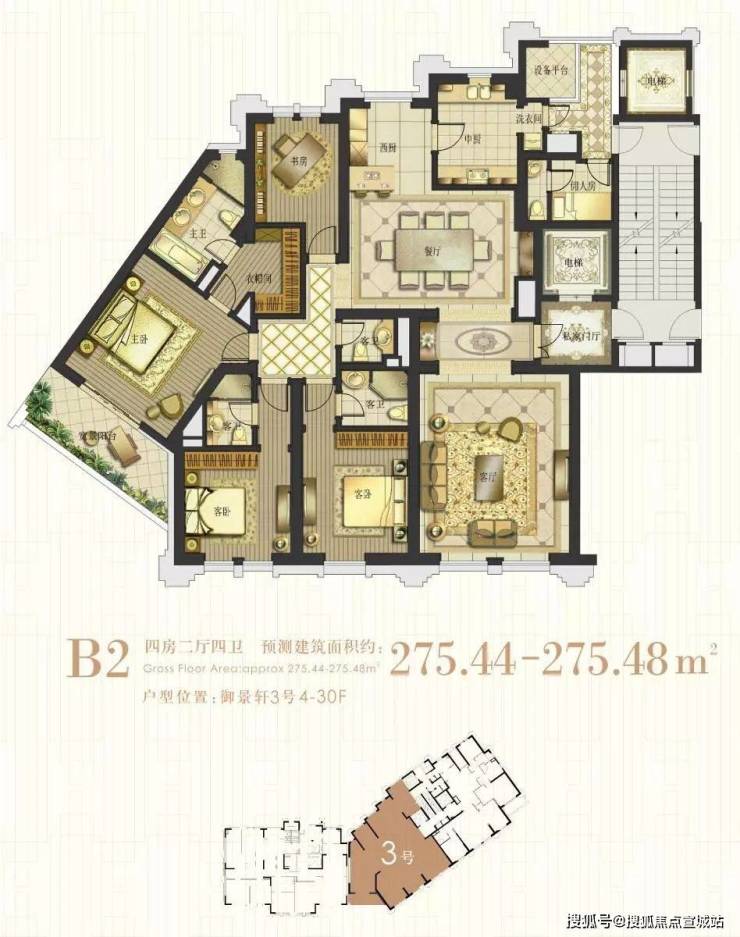 3号01室:275㎡4房2厅4卫,客厅朝东朝北,客厅和三个房间朝南,书房朝北