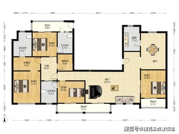 7号01室:222㎡3房2厅2卫,客厅朝西朝北,三房并排朝南