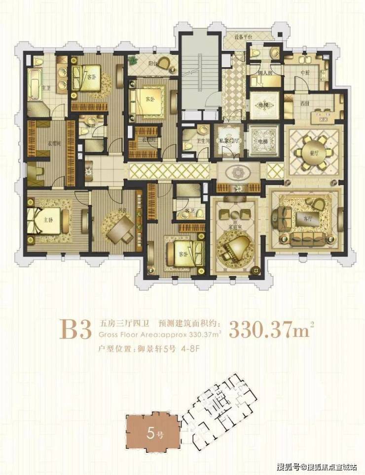 户型:5房3卫,两梯一户(保姆独立电梯,全明卫)