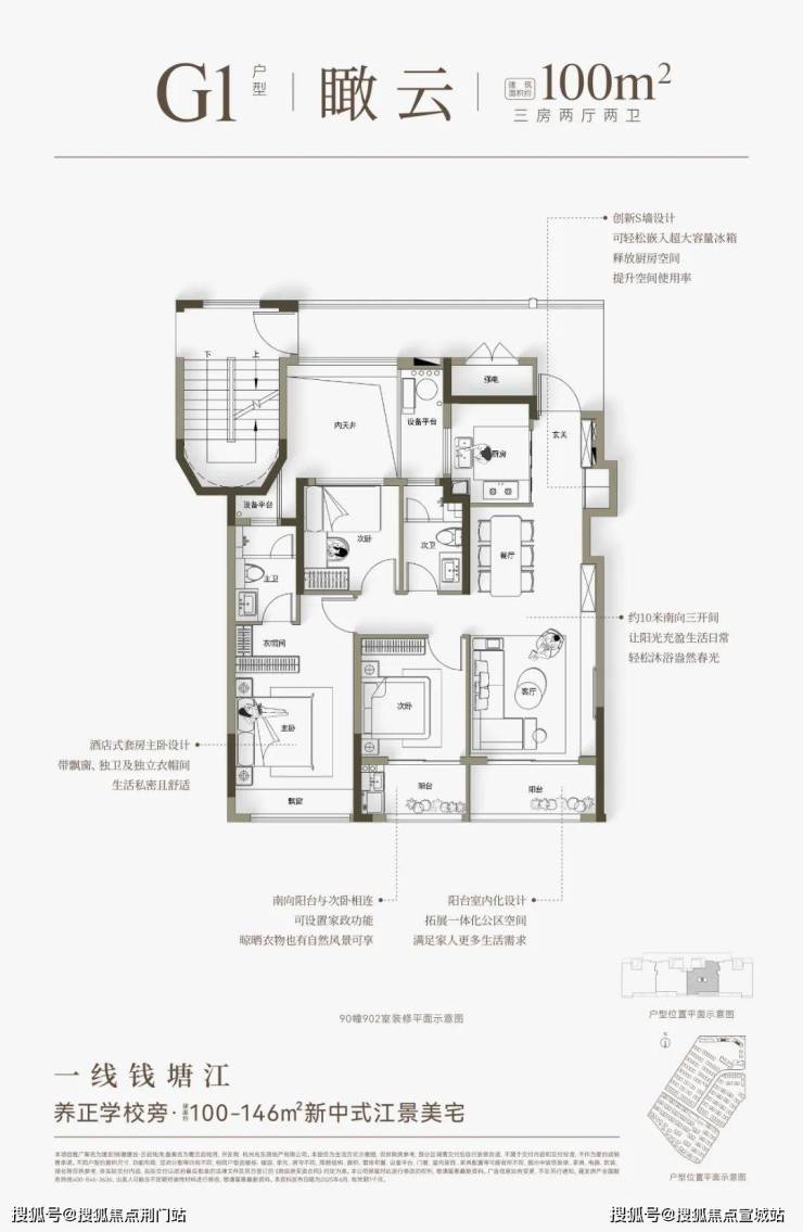 建面约100㎡的三房户型,三开间朝南,U型厨房,每一处细节都考虑到了。