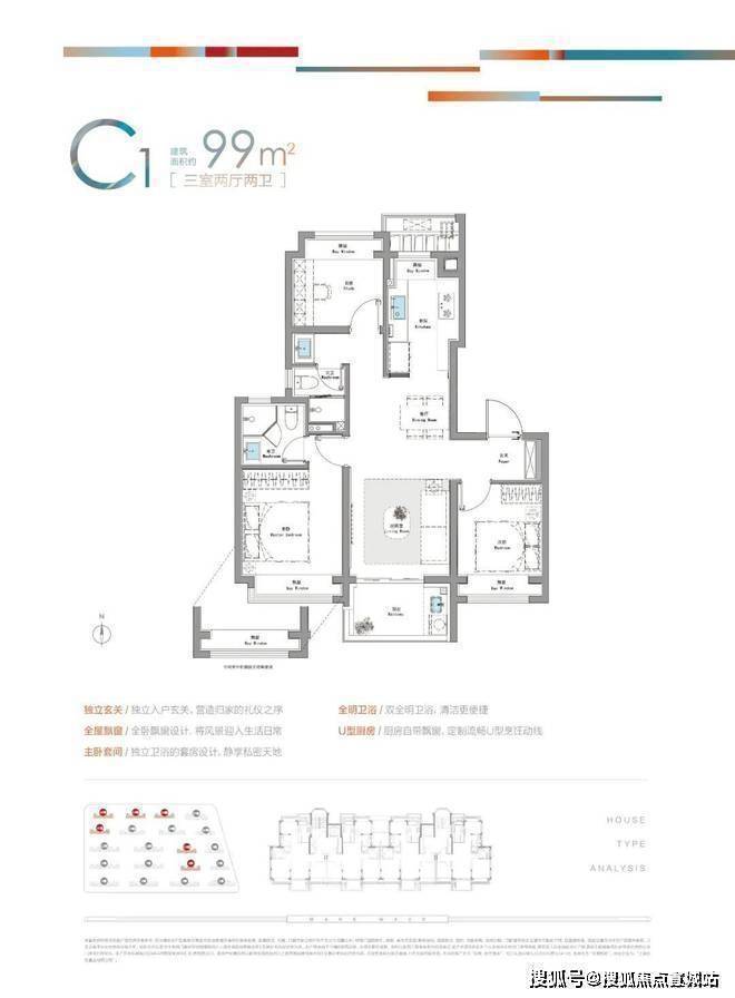 建面约99㎡C1户型则是典型的三开间朝南飞机户型,整个套内几乎没有走道,拒绝空间浪费,让业主有更加出色的居住尺度感。