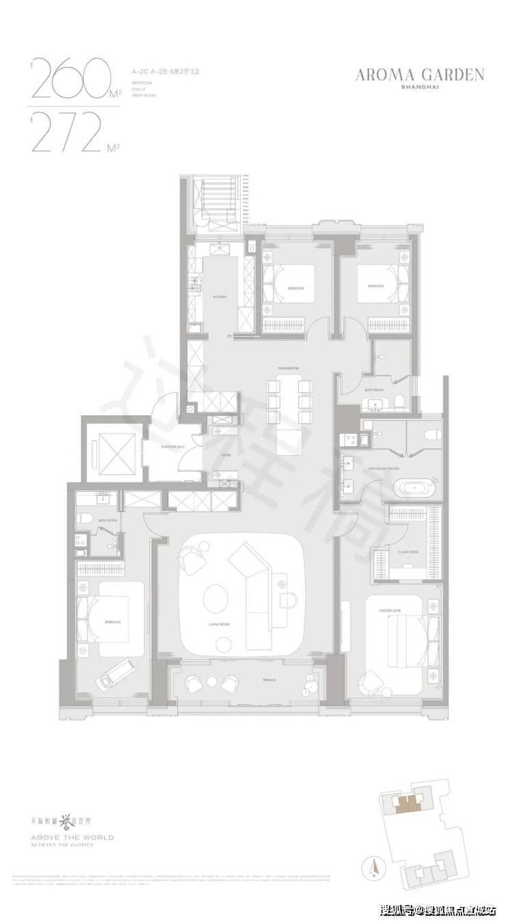 其中,A地块共计150套天际大平层,面积为建面约264-901㎡,主力户型为4房-5房。