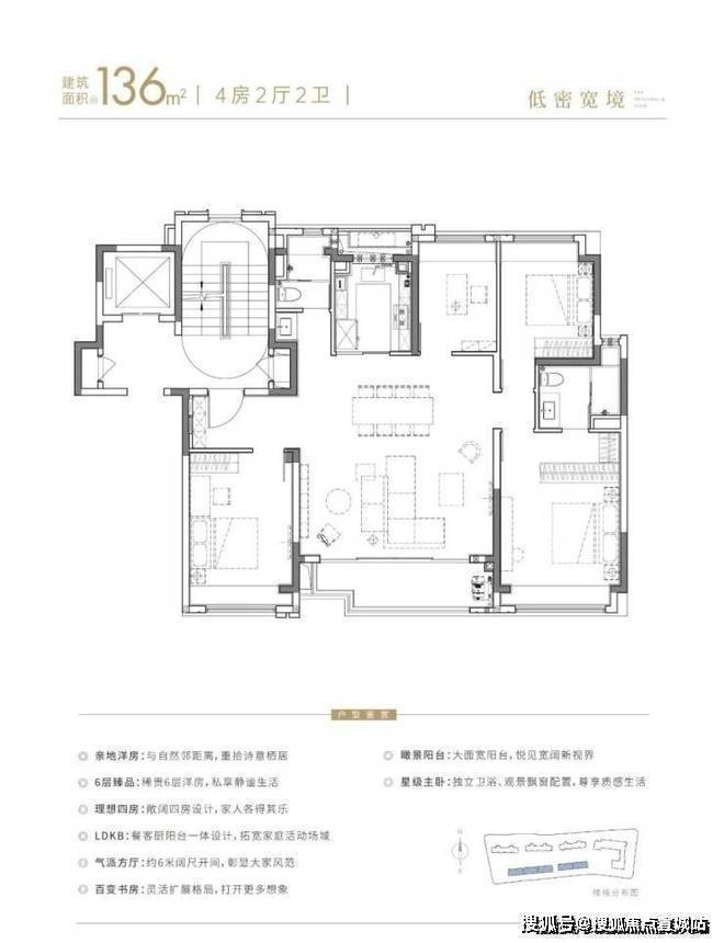 建面约136㎡6层洋房纯粹的亲地性和高得房率,既能满足三代同堂居住需求,也能保障私密性和居住体验感的提升;