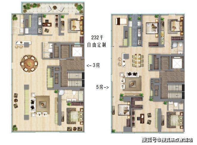 以232㎡面积产品为例,既可以做成3房也可以做成5房,全看用户灵活定制要求。