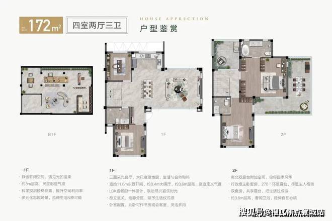 建面约155㎡4房2厅3卫户型:除了在2楼拥有270度大露台之外,北向竟然也贴心打造了观景露台。一楼也多了一个书房,功能区设计动静分离的同时又能保障照顾到家里的每一个人。