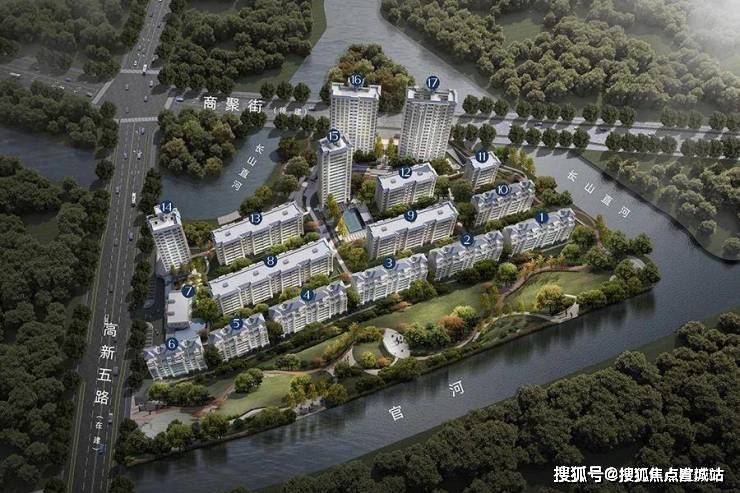 项目总体布局体现为“一环、两轴、三围合”的设计构思.一环”是指连接小区主次入口的主环道以及形成小区中央的大花园,“两轴”是指贯穿小区东西和南北两条相交的主要景观轴线,“三围合”是指小区南侧有50米城市绿化带,东侧和北侧均有20米城市绿化带,三面均被景观绿化带和东侧的长山直河、南侧的官河,北侧的郎家浜河所环绕,自然景观俱佳.