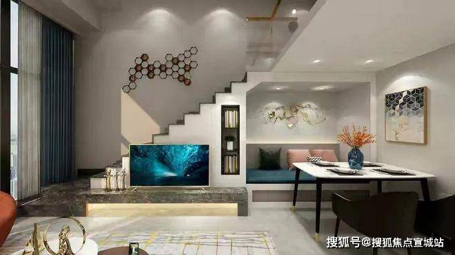 保留了客厅的挑空,将复式盘的优势被发挥得淋漓尽致。并且,一整面落地窗让整个空间更显大气。沙发旁摆放的新中式风格的小边几搭配着白色长城板,也是将整个客厅增堆满的高级感。而窗边放置的懒人椅,可以在下班后卸下满身疲惫,放松地欣赏着这灯红酒绿的世界。