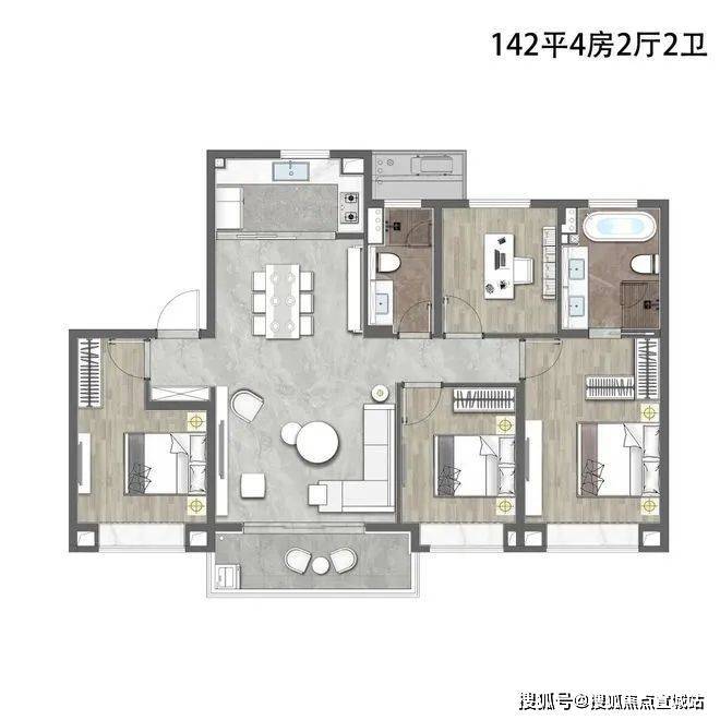 该户型做到了三开间朝南+超大面宽横厅+主卧套房设计+卫生间干湿分离+南北通透,功能性和尺度感完美结合。
