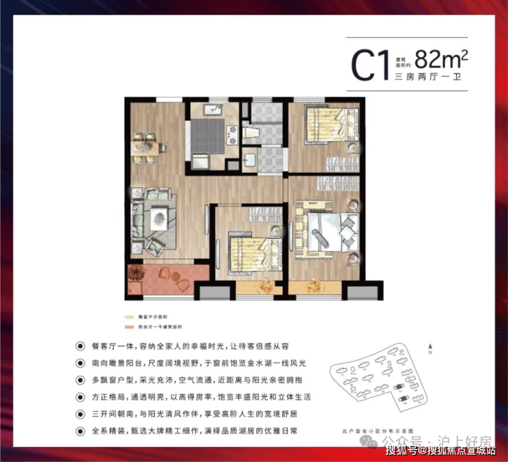 客厅面积约11.38㎡米,附带外凸式南阳台,入户门可设鞋柜,卫生间干湿分离。