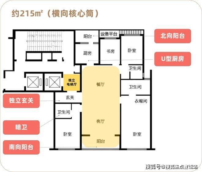 215㎡的纵置核心筒户型,与横置核心筒相比,整体布局更加紧凑,但功能分区同样出色。