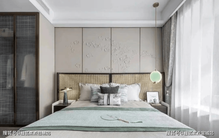 藤编式的大床,还有青色的灯具,都让整个主卧更有一派儒雅之美.
