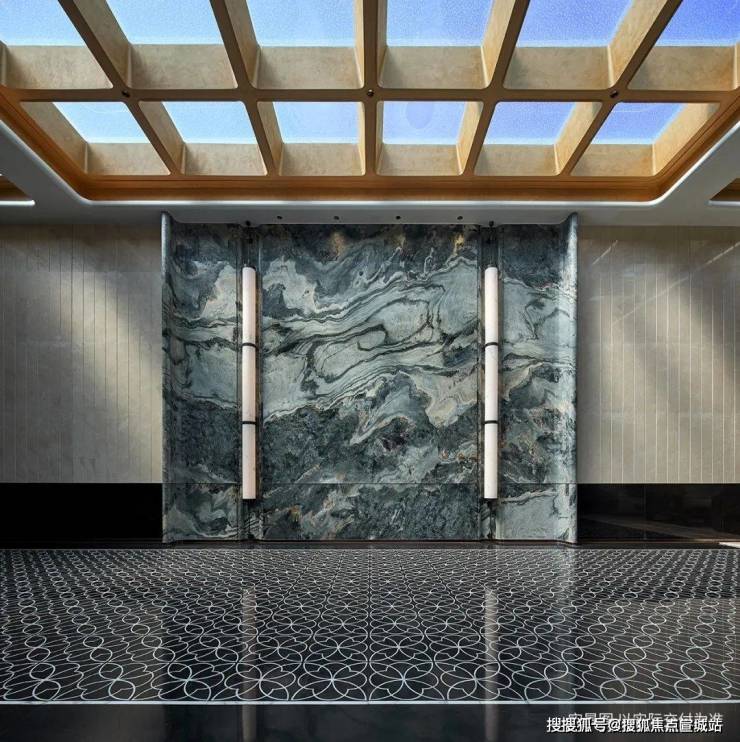 进入大门,就是未来的小区入户大堂,首先映入眼帘的是精选的背景墙,采用的是奢石“万象山河”:它的纹理独一无二、自带磅礴气势,市面上能达到这种尺寸与纹理质感的奢石十分稀缺,以“包罗自然万象”为理念,强调天然美学,多运用在高端酒店大堂内