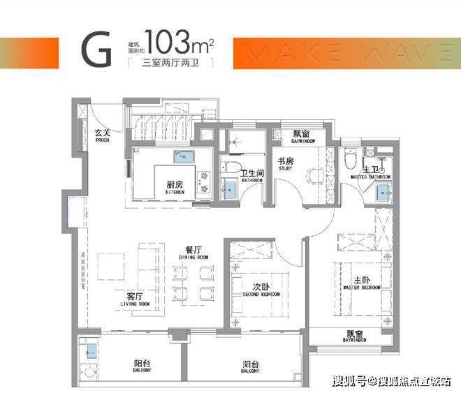 建面约103户型,南向超大面宽+双阳台,品质三房的不二之选!
